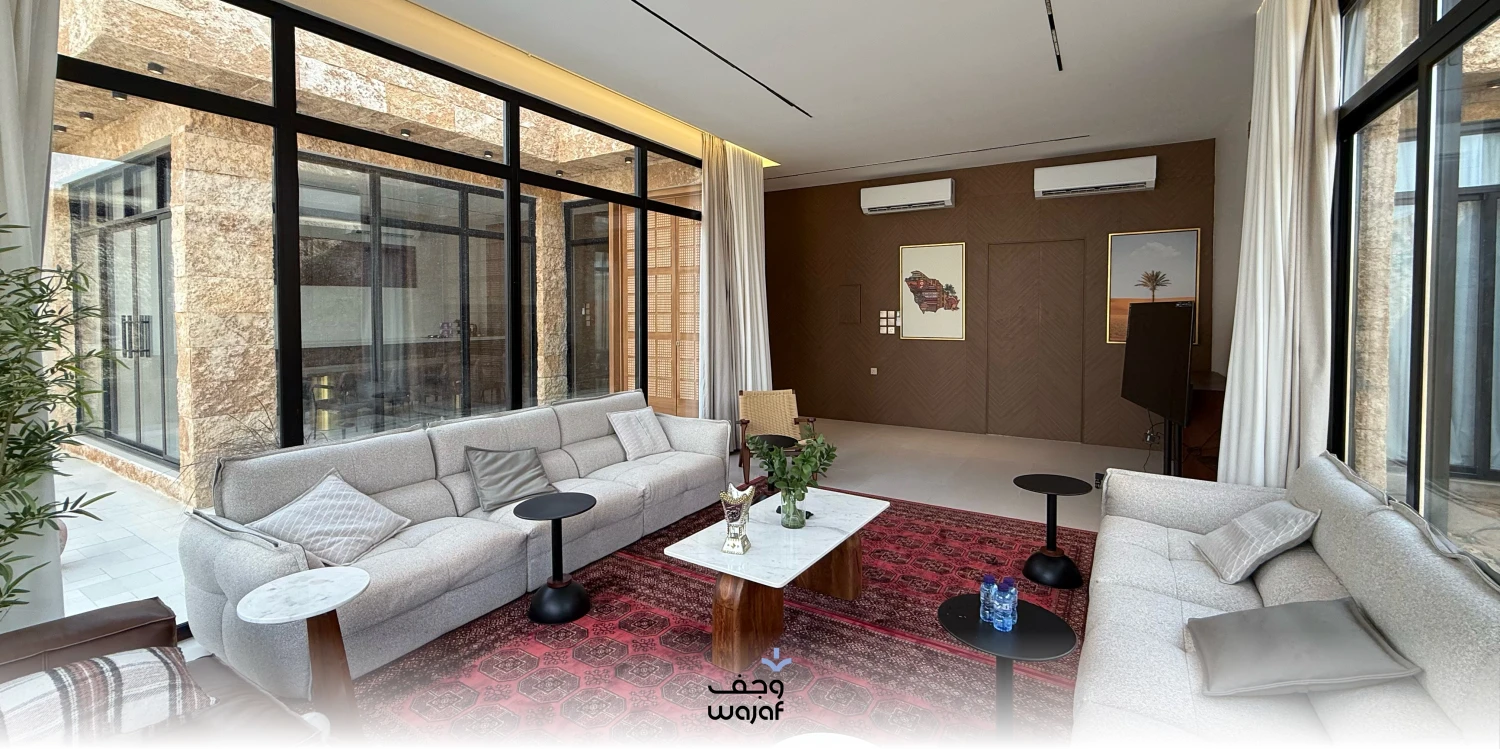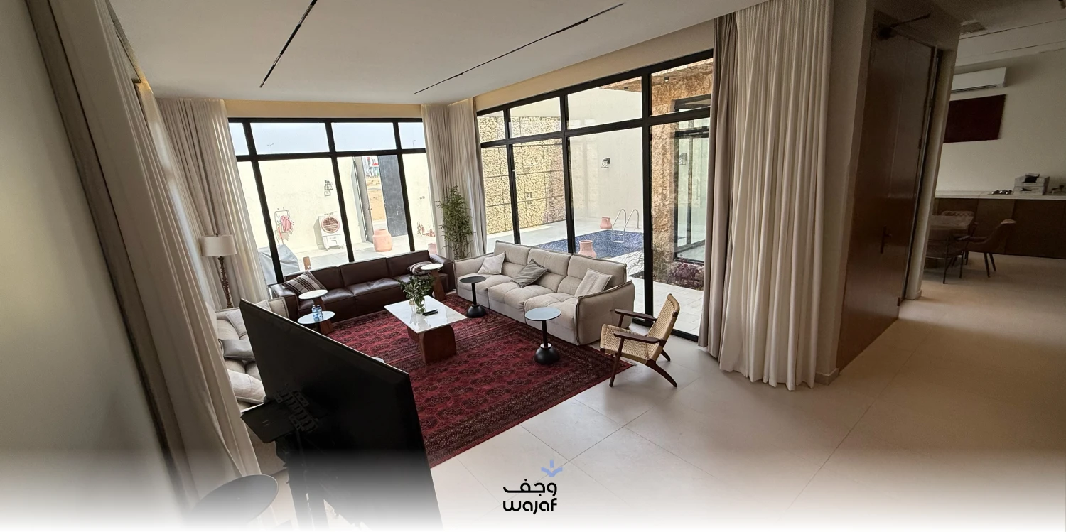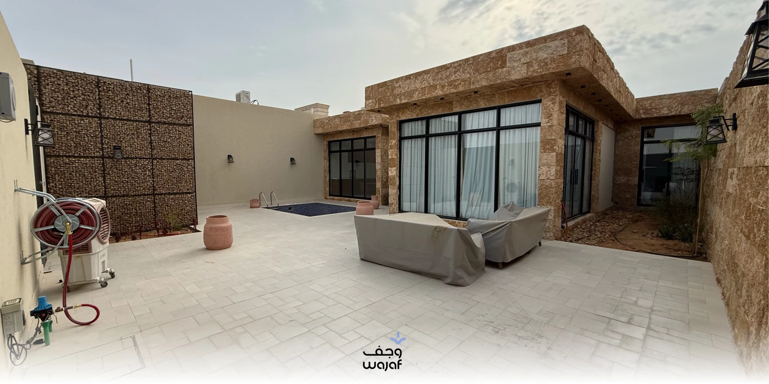 شاليه جديد واجهه حجر يتميز بالتصميم والإطللات البانورامية الواسعة مطله من كل الجهات على الحديقة والمسبح والجلسة الخارجية، تم التأثيث بذوق عالي من براندات مميزة (دايز، باتنويا، اشلي) مع اللمسات الداخلية بتكسيات من الغملاس، والخشب من الخشب المبتكر